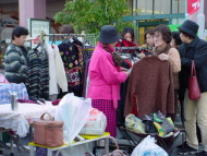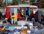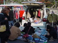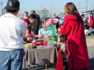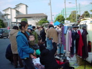 | 今回の会場内では衣類や日用雑貨の他に 手作りの布製手提げ袋や、古本などが並んでいました。 中には楽器(バイオリンやギターetc)やアンプなどを格安で 売っている出店者の方もいらっしゃいました。 小さな子供たちには風船細工が人気で、作って欲しい動物を リクエストして、出来上がるまで興味深く見ているのが とても可愛く、印象的でした。 |