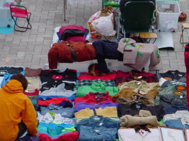 | こちらは出店ブースの陳列の様子です。 たくさんの衣類を綺麗にたたんで とても上手に並べてありました。 これだけ並べるのには かなりの時間が掛かったんだろうなぁ。 そのパワーにびっくり! 思わず撮ってしまった1枚でした。 |