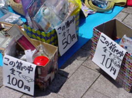 | 会場で見つけました。安売り箱! ブースの入り口に箱ごと置いて 安売り・安売り。 10円箱があるのにもビックリ! それぞれに絵も描いてあって 思わず見てみたくなりました。。 |