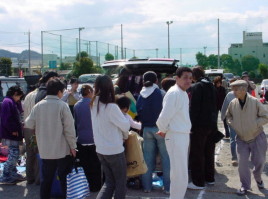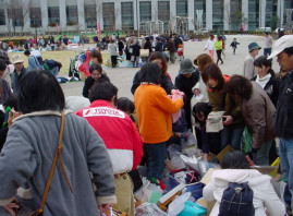 | 会場で見つけた、お客様の様子(→) 人垣が出来ていて、いったいどんな品物が 並んでいるのか・・・? 後ろからは全く見えず、 お客様の前には、またお客様、 その前にもお客様が・・・ きっと、魅力的な掘り出し物が あったんでしょうね。 |