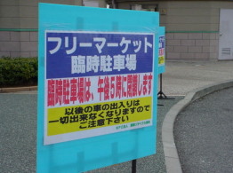 | こちらは、会場に隣接した 臨時駐車場の看板です。 出店者の方は、こちらの臨時駐車場に 駐車する事になっています。 こちらの駐車場は午後5時には閉鎖し、 その後は車の出入りが出来なくなります。 駐車する時には気をつけて下さいね。 |