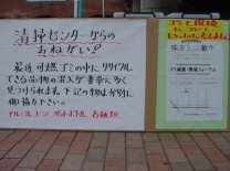 | こちらは 清水市清掃センターの パネルです。 清掃センター足立さんに 協力して頂き、今回から 会場受け付け横に 展示することにしました。 ゴミに関する資料なども あります。見て下さいね。 |