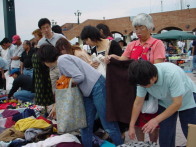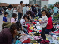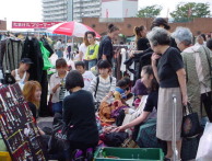 | 出店者の方も途中からの雨や、強い風に悩まされていたようです。 雨が降って回廊下(屋根下)に非難する方、シートやテントで 雨をしのぐ方、ぱっと片付けてしまう方・・・それぞれでした。 出店者同士で協力し合って下さったのでとても嬉しく思いました。 中には「雨が降りそうなので、安くしちゃいまーす!」と 値段を下げて売っている方もいましたよ。 また、今回の出店の中で注目されたのが 『衣類 袋詰め放題』を行ったブースの方でした。 午後になり「大きい袋は500円、小さい袋は300円デース!!」の掛け声に あちらこちらからお客様が集まってきました。 今までにない?やり方で、面白かったですよ。 |