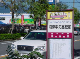 | こちらは、会場近くのバス停留所です。 沼津中央校高前で下車、徒歩1分です。 すぐ目の前が会場となります。 車の通りが激しい国道沿いなので 会場反対側でバスを降りた場合は 車に気をつけて、歩道橋を渡って会場に 来てくださいね。 |