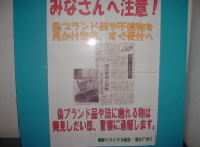 | 今回より受付の横に、大きな看板で 「みなさんに注意」と偽ブランド商品、 また不信物の通報呼びかけの 表示をしました。 出店者はもちろんですが、たくさんのお客様が 足を止めて読んで下さいました。 「こんなことが、あるんだね。」 「ぼくらじゃ本物だと言われたら、そう思ちゃうし 見分けがつかないからね〜。」 と話をして行かれる方もいらっしゃいました。 |